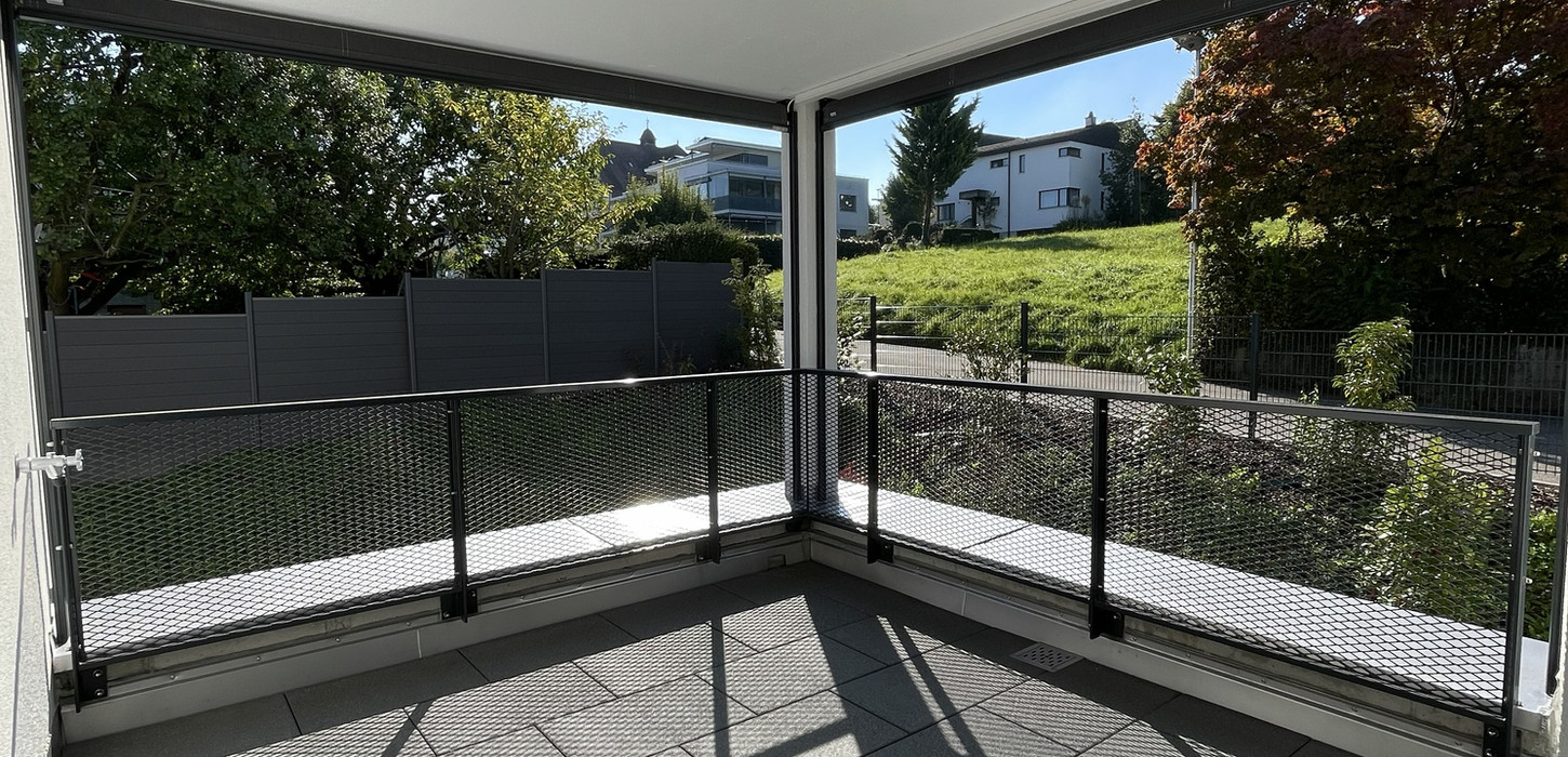 Auch die Terrasse ist mit elektrisch steuerbaren Sonnenschutzstoren ausgestattet – perfekt, um sonnige Stunden im Freien ganz nach Wunsch zu geniessen.